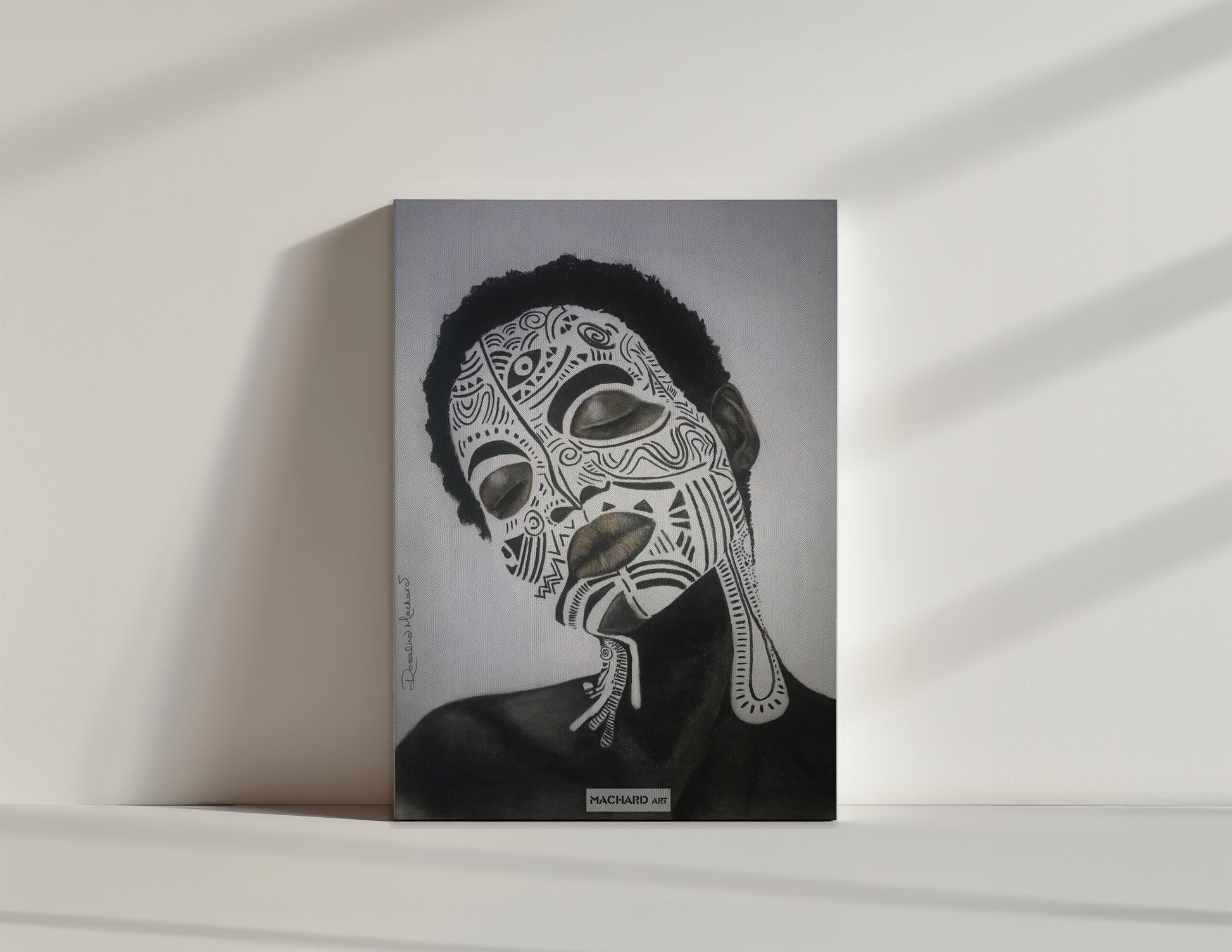 This captivating black and white portrait by Rosalind Machard depicts an African woman with her eyes closed and her head tilted slightly. The intricate details and shading of the artwork beautifully capture the woman's serene expression, conveying a sense of peace and introspection. The use of black and white adds to the timeless quality of the piece, making it a striking addition to any collection.